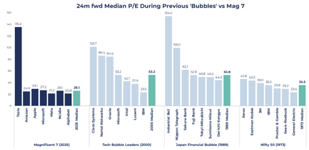 • Magnificent 7 valuations are nowhere near 1999, 1980s Japan, or China 2015 levels