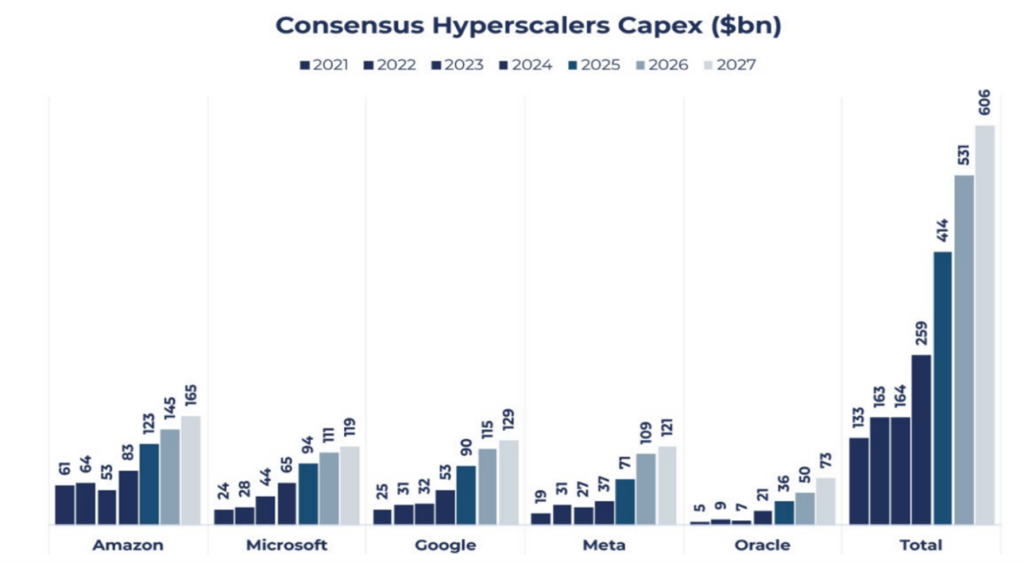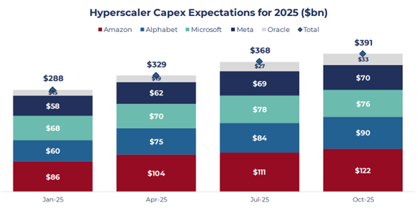• Hyperscaler capex is rising fast (2025 expected: $288B → $391B)