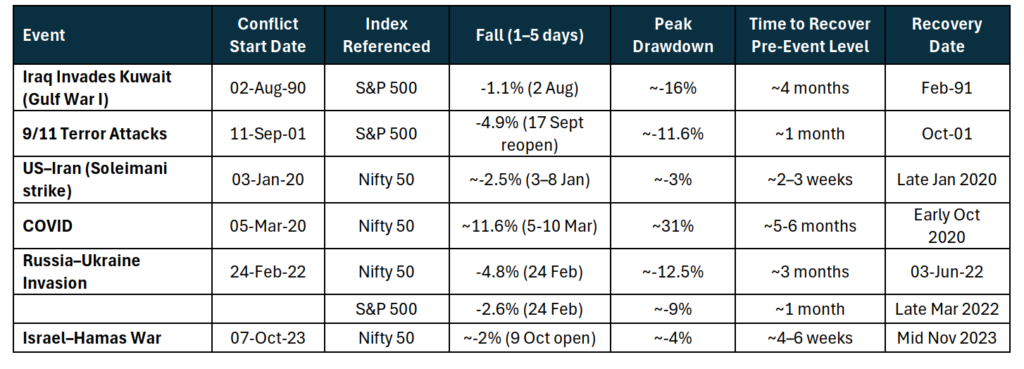 Geopolitical events typically trigger sharp but temporary volatility. History provides useful