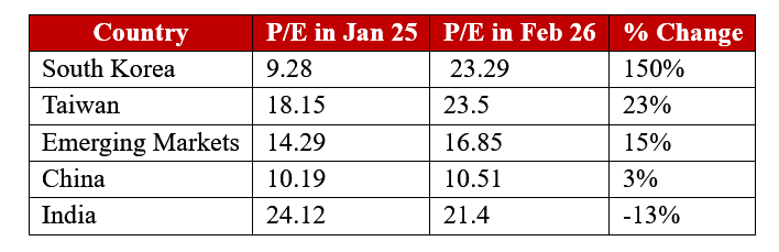 South Korea’s sharp re-rating and Taiwan’s steady expansion reflect strong investor appetite for semiconductor and AI-linked markets. India’s multiple, by comparison, has remained broadly stable to slightly lower.