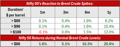 • When Brent crude stays below $80, Nifty has historically delivered stronger returns, with 1-year gains averaging around 20%.